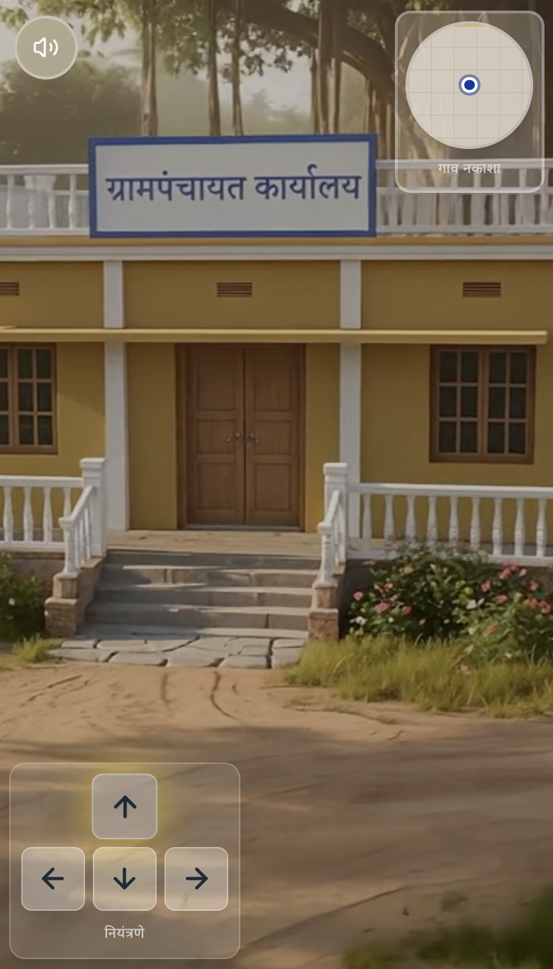 Panch Dhara is a spatial learning platform. Open it on a phone or computer and you see your village - a navigable map with buildings you can walk into. Each building is a learning scenario.